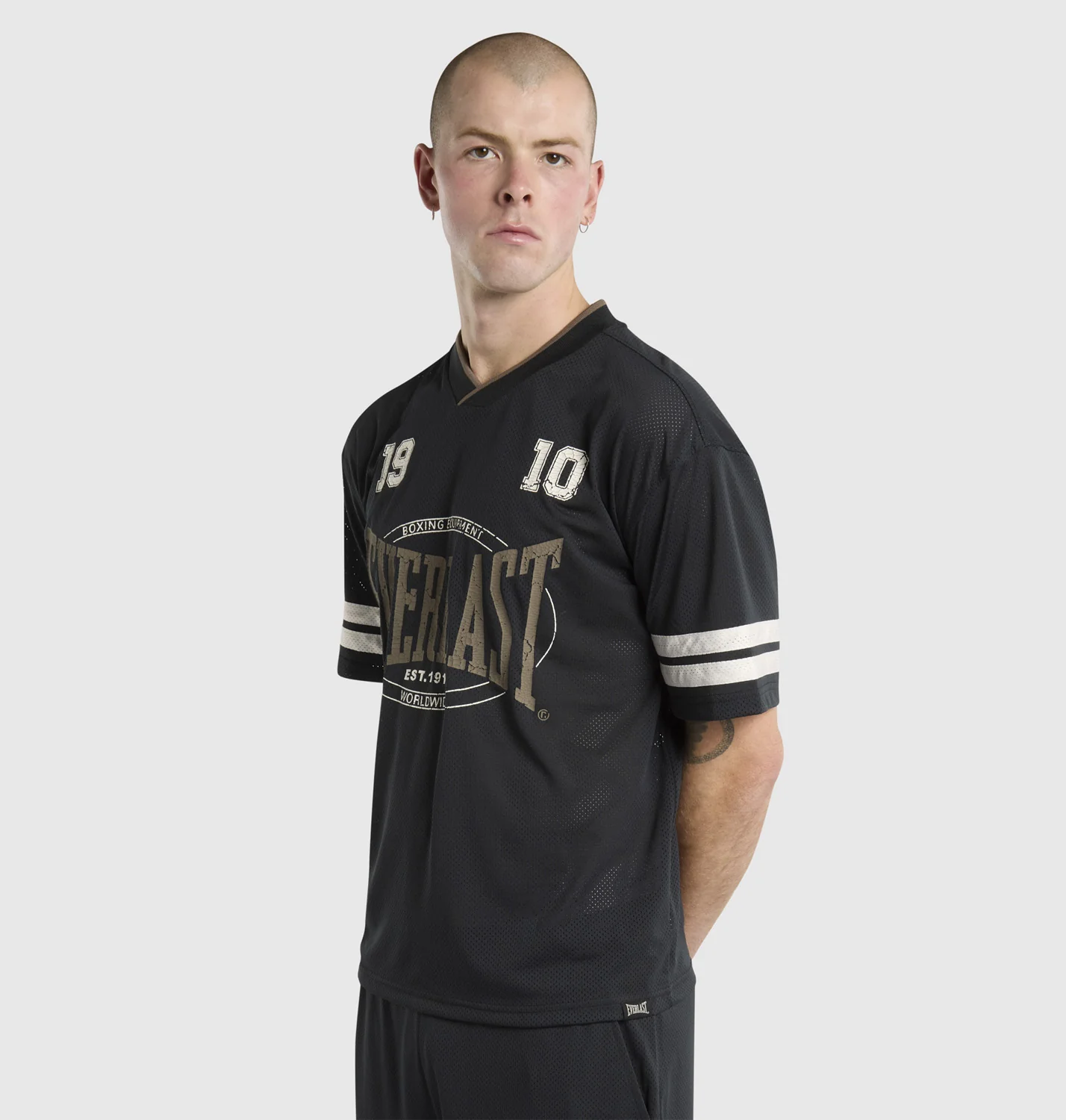 Capture the spirit of the game with the Field Jersey in black, inspired by American football. This jersey features a bold 1910 Everlast crackle print on both the front and back chest, paired with contrasting self-fabric stripes on the sleeves for a vintage athletic look. The two-tone V-neck rib and forward shoulder seam enhance comfort and style, while the box fit offers a relaxed, contemporary silhouette.