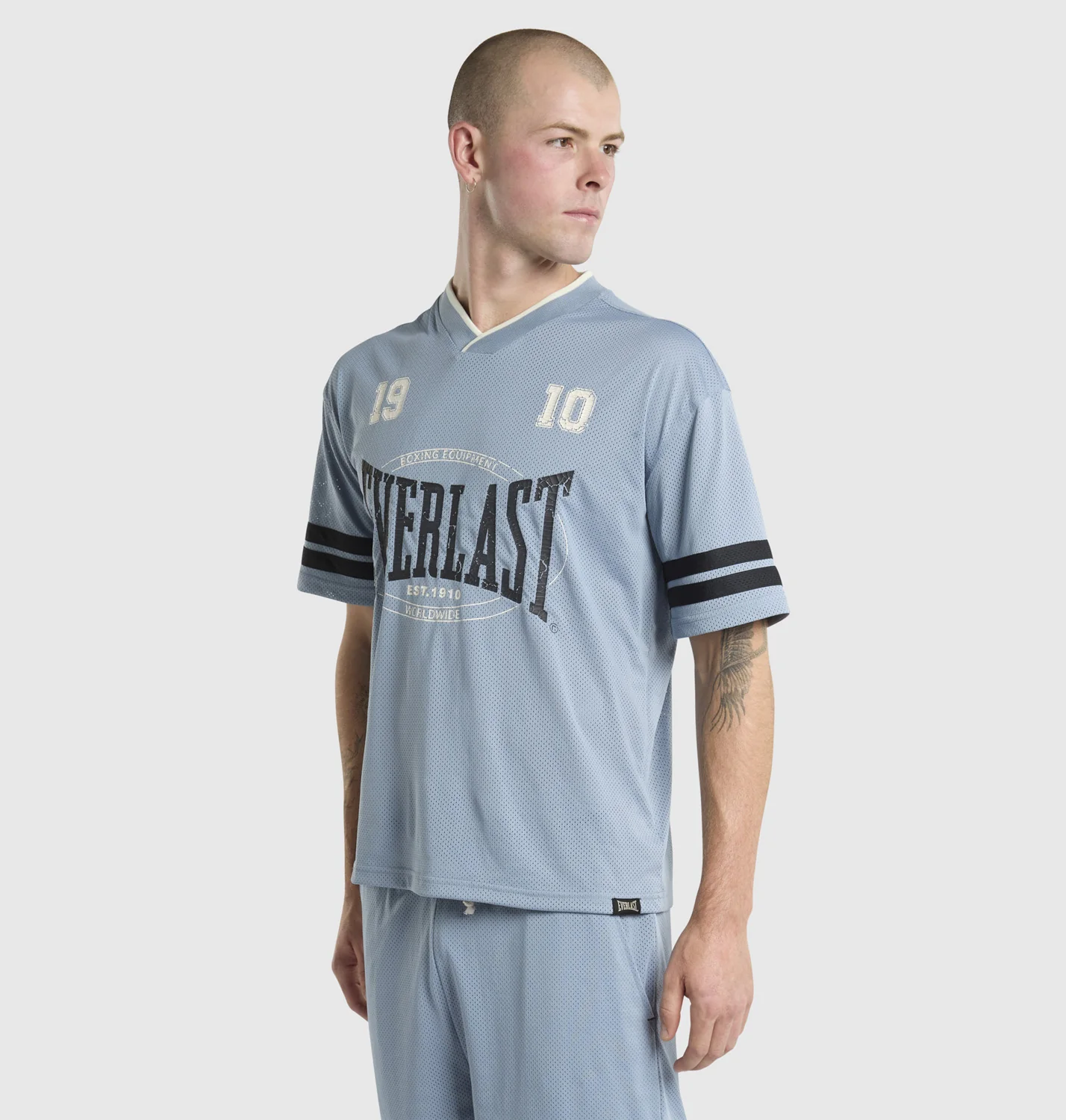 Capture the spirit of the game with the Field Jersey in vintage sky, inspired by American football. This jersey features a bold 1910 Everlast crackle print on both the front and back chest, paired with contrasting self-fabric stripes on the sleeves for a vintage athletic look. The two-tone V-neck rib and forward shoulder seam enhance comfort and style, while the box fit offers a relaxed, contemporary silhouette.