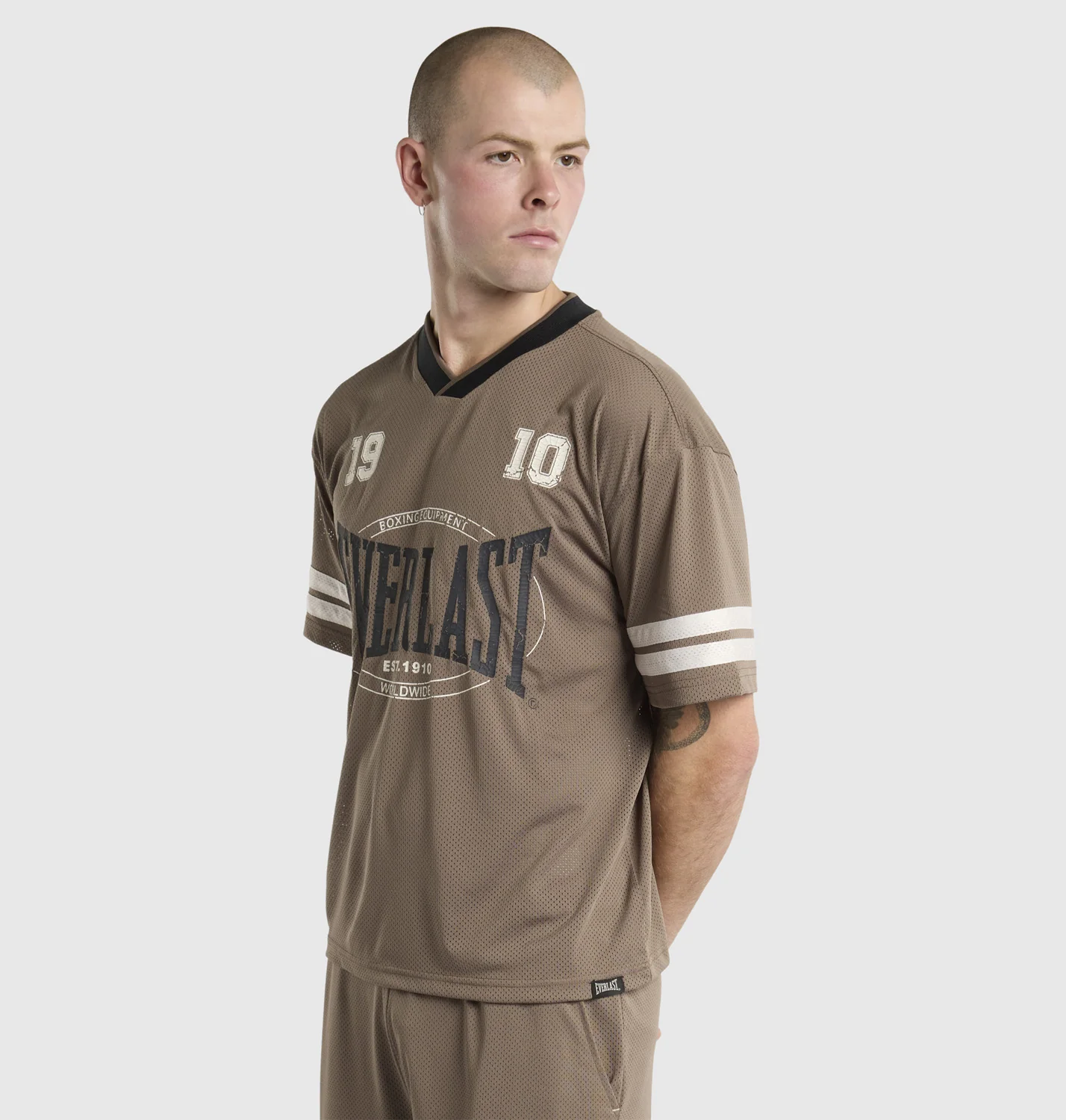 Capture the spirit of the game with the Field Jersey in walnut, inspired by American football. This jersey features a bold 1910 Everlast crackle print on both the front and back chest, paired with contrasting self-fabric stripes on the sleeves for a vintage athletic look. The two-tone V-neck rib and forward shoulder seam enhance comfort and style, while the box fit offers a relaxed, contemporary silhouette.