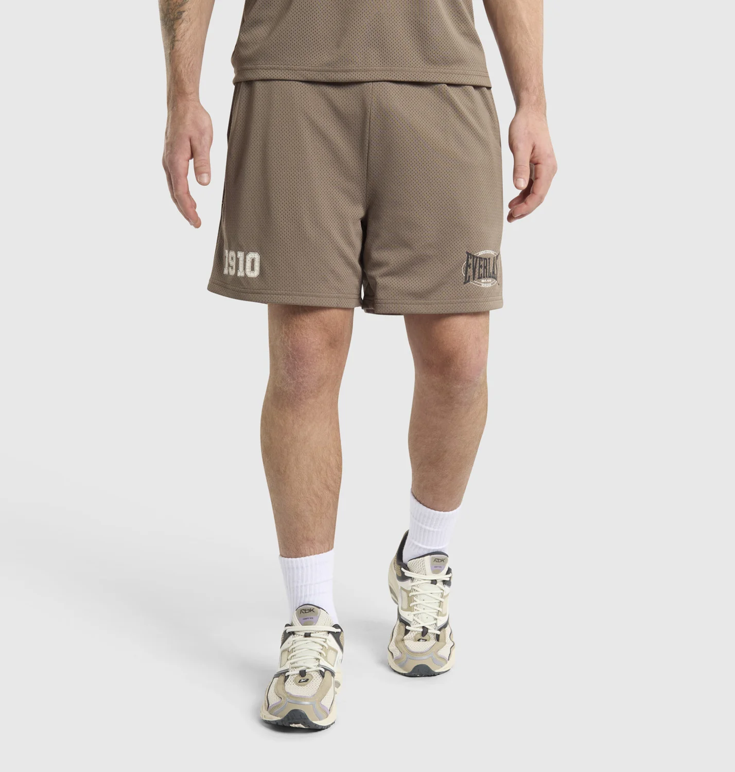 Field Mesh Shorts are all about relaxed style with practical details. Featuring our 1910 Everlast crackle print on the front leg hems for a unique look. These shorts in walnut are constructed with a double-layer lining and include an elasticated waistband with a drawcord for a secure fit. Equipped with front side pockets and an additional back pocket with a woven label badge, these shorts offer both style and functionality for everyday wear.